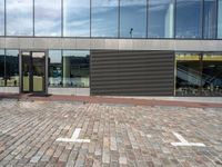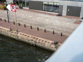 A view of a city street in Holland, with asphalt road surface, modern architecture, a grey building, cobble stone pavers, vegetation, a bridge, a lake, and a street light.