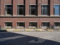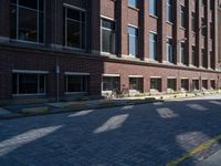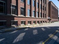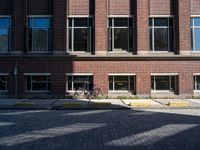 A bicycle leaning against a brick wall in a residential area of a Dutch city. The grey brickwork, asphalt road surface and public space create a classic architecture with hard shadows, providing a contrast between the high-rise condominiums, vegetation and tar-covered infrastructure.