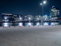 A view of Holland's cityscape at midnight, featuring a modern architecture of high-rise buildings, river pier, road surface, and street light. The clear sky reveals the infrastructure and composite material of the metropolitan area, illuminated by artificial light and electricity.
