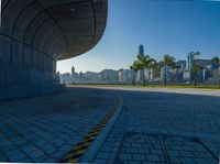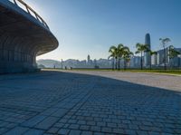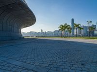 A stunning view of the urban cityscape of Hong Kong, with clear skies and skyscrapers towering over the pier and harbor area. The hard shadows create a dramatic effect, while the open space allows for a beautiful waterfront experience.
