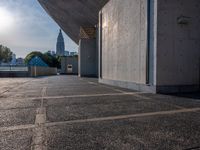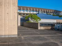 The sun is visible above the 1/4 quarter gravel area of an urban sports stadium in Tokyo, Japan.