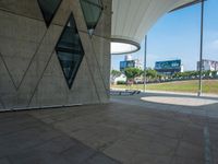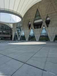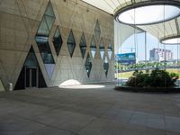 A glass wall of the Formosa Art Center in Kaohsiung, Taiwan casts hard shadows on the concrete surface of the urban city below. The open space of the art center provides a respite from the city life of the Republic of China.