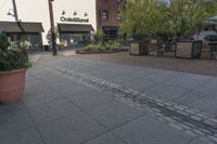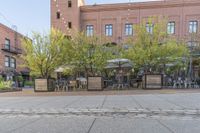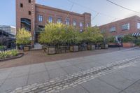 A straight down view of the urban design and landmark of the city featuring a brick wall facade, cobble stone road surface, asphalt road, public space with outdoor furniture, clear sky and tree vegetation, residential area with a condominium, house, and wheel infrastructure.