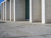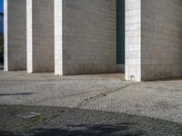 A modern cityscape of Lisbon, Portugal featuring a composite material facade with brickwork, shades of grey and beige, cobble stone and asphalt flooring, and a public plaza with open space.