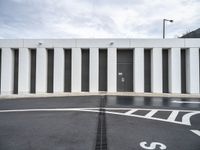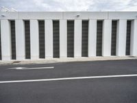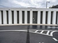A composite material zebra crossing divides a modern architecture office building and residential area in Lisbon, Portugal. Grey tints and shades of the asphalt road surface, automotive tire, and tar contrast with the clear sky and vegetation, creating a unique urban design.