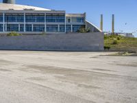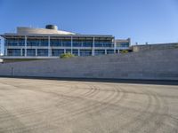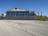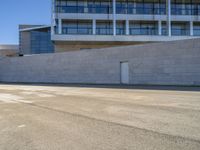 A modern office building with a concrete facade, tints and shades, and a pier in the background is seen on a sunny day in Lisbon, Portugal. The skyline combines urban design with residential areas, naval architecture, and a stadium to create a unique landscape in this European city.