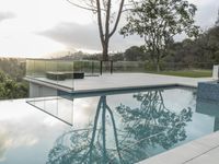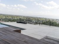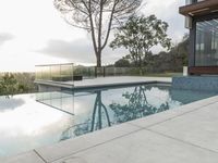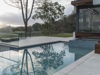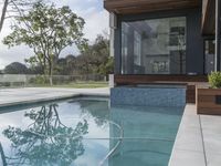 Aerial view of a modern architecture building with artificial turf, a pool, a garden, a pond, a boardwalk, and other leisure amenities in the backyard and courtyard of a residential area in Los Angeles, California, USA. The estate features a variety of materials such as metal, composite, wood, tile, concrete, and grass, and the sun is shining on the winter day.