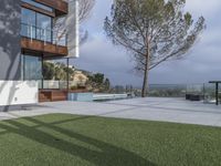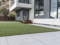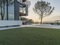 Early morning in Los Angeles, California, USA. The modern architecture of the residential area is illuminated by the sun, revealing the open grassy space, house facades, trees, gardens, and backyard of the villa. The urban design of the property features artificial turf, concrete tile flooring, and walkway pavers.