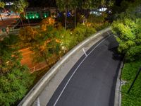 A top-down view of a curved road in Los Angeles, USA, illuminated by artificial light and surrounded by asphalt, emphasizing the city's urban design at night.