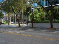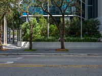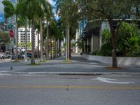 A busy office building on a sunny day casts a hard shadow onto the asphalt road in Miami Beach, Florida, USA, highlighting the bustling city life of the business district.