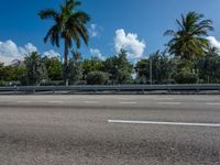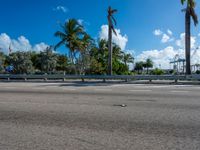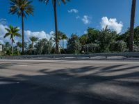 A road with a hard shadow leads to a stunning skyline of skyscrapers in Miami, Florida, USA. The coastal cityscape features the ocean and clouds in the background.