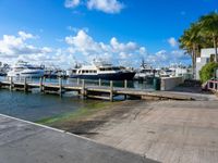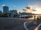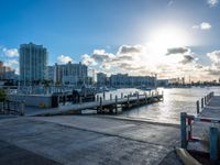 A boat ramp and jetty, illuminated by the break of day in Miami Beach, Florida, USA. The hard shadow of the pier and open space create a coastal urban landscape, with the visible sun and sunshine dancing on the surface of the ocean.