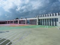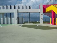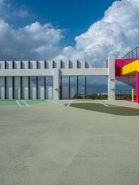 A straight view down a city street in Miami Beach, USA reveals a bustling urban area filled with open spaces, art districts, and concrete surfaces. Clouds stretch across the sky as the day takes hold in this vibrant city.