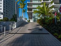 The sun casts a hard shadow on the paver road in the residential area of Miami Beach, Florida, USA.
