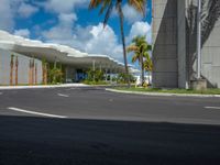 A parking deck, asphalt road, and palm trees create a unique urban design in the city of Miami Beach, Florida, USA on a cloudy day, creating hard shadows and greenery.