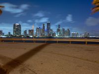 A dark night in Miami Beach, USA, where an armco barrier and guard rail line the coastal road, connecting the urban cityscape to the ocean.