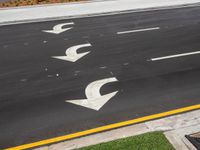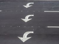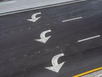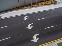 A top down view of the urban design of Miami, Florida. An elevated road curves over a bridge, a parking deck and parking garage, as well as a palm tree-dotted crosswalk are visible. Greenery and hard shadows provide contrast to the asphalt of the cityscape below.