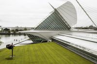 A view of Milwaukee, Wisconsin, USA featuring modern architecture, urban design, and a variety of nonbuilding structures such as an airport, bridge, and convention center. The skyline is highlighted by a grey sky, with both sun and shade visible, and the reflection of the buildings in the water. A tourist attraction and a popular destination for vacations, Milwaukee offers a unique experience of high-rises, skyscrapers, and corporate headquarters. The city is also home to a variety of architectural elements like roads, walkways, and surface materials such as asphalt, concrete, and grass.
