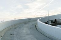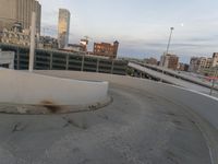 An aerial view of Milwaukee, Wisconsin, from high above the city. The urban landscape spans the horizon, a mix of highways, residential areas, open spaces, skyscrapers, bridges, and more. The concrete street stretches straight down the road, lined with guard rails, hand rails, and parking decks. The sky is dotted with contrails, and the sun is just beginning to peak above the horizon.