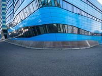 The concrete and asphalt roads lead to a modern high-rise office building in the metropolitan area of Holland, Netherlands. The yellow and grey tints and shades of the building facade contrast against the blue sky and its glass windows and doors. The street lights and vehicles of the urban public space are visible in the foreground.