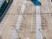 Aerial view of an asphalt road surface on a slope in Holland, Netherlands, with blue, beige, and grey composite material, wood, and concrete elements. A modern parking lot with parallel lines, rectangles, and public space is visible in the foreground.