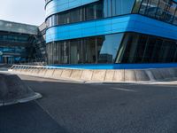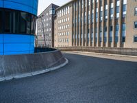 The modern architecture of the city of Holland, Netherlands, is on display in this profile view of a switchback road, open space, and a business district. A bus stop and office building are visible in the distance, while the asphalt curves straight down the road.