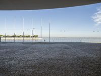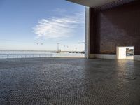 A peaceful scene of the city of Lisbon, Portugal. The architecture is a composite of modern design and traditional cobble stone, with a diverse range of vegetation providing shade and texture. The open space and flooring is surrounded by asphalt and the calm ocean in the distance, creating a picturesque modern urban landscape.