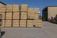 A sunny day in the city with clear blue sky and a road leading to a modern retail store made of composite materials and brickwork.