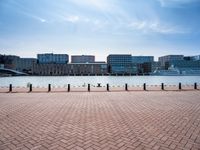 The sun rises over the river in Holland, illuminating the modern architecture of the cityscape and the paver roads that lead to the pier and harbor. The skyline is dotted with high-rise buildings, and a flag waves in the open space. The city's urban design is highlighted by the clear sky and the surface of the lake, creating a beautiful landscape of city life, residential areas, and leisure.
