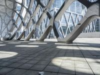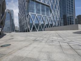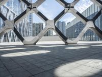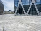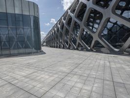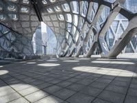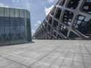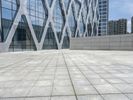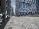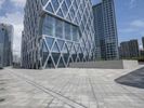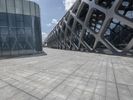 The modern architecture of Shenzhen, China is showcased in this public courtyard, with its open space, lines, walkways, arches and reflective surfaces. The metal walls, trees, cloudless sky and abstract designs create a futuristic and urban feel to this metropolitan area.