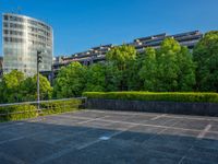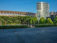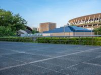 A profile view of Tokyo's urban design featuring a gravel surface, city life, and a bright cloud-filled sky.