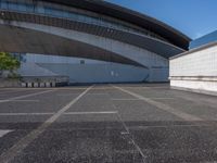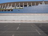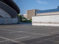 A view of the city of Tokyo, Japan with a gravel surface and stadium in the foreground, and a skyline of buildings and clouds in the background.
