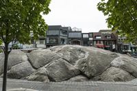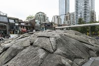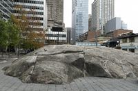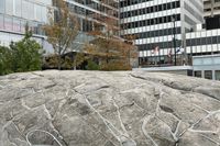 A gloomy day in Toronto's urban design featuring a mix of high-rise condominiums and office buildings with open spaces and outdoor furniture.