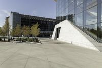 A low angle view of a residential area in Toronto, Canada. The image shows a mix of buildings, houses, and condominiums surrounded by open spaces, trees, and vegetation. The sunlight creates a beautiful play of light and shade on the facades and windows of the buildings.
