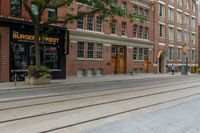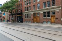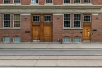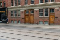 A profile view of a high brick wall in Toronto, Canada. The urban city life can be seen as people eat out at a cafe on the elevated concrete street, near a restaurant and bar.