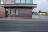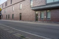 A beautiful view of the urban design in Toronto, Ontario, Canada. The residential area features stunning buildings with brick facades and large windows, surrounded by open spaces and vegetation. The clear sky and dawn create a serene atmosphere.