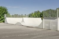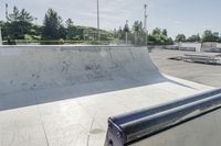A view of the high, elevated buildings and architecture in Toronto, Ontario, Canada on a clear day. The city's urban design features low, concrete roads and asphalt surfaces, providing open spaces and recreational areas for sport and relaxation, such as the skatepark seen here.