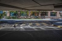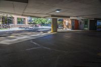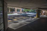 A view of a modern building with concrete flooring and a glass ceiling in Toronto, Ontario, Canada. The urban design features a spacious open space with a grey asphalt road surface, parking deck, and parking garage. The cityscape is adorned with trees and vegetation, creating a vibrant public space. The architecture showcases a combination of composite materials and fixtures, with tints and shades adding depth and dimension. The photo captures the straight road leading to a bustling metropolitan area, with electricity lines and street art adding character to the scene.