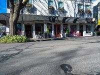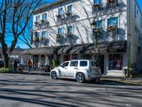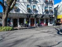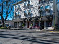 A clear day in the city of Washington, USA, showcasing the urban design with bustling city life, shops, and storefronts along the asphalt road.
