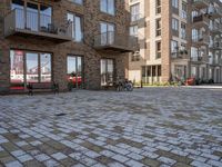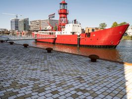 A composite material road surface leads to a modern architecture condominium building in a residential area of Holland, with a pier and jetty, a lighthouse, a vehicle, a boat, and a bank in the background, as the clear sky of dawn reveals flowers, trees and vegetation near the harbor and lake.