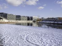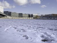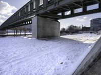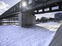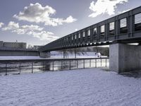 A view of a city's infrastructure and urban design in the winter, featuring an asphalt road, concrete curbs, metal street lights, monochromatic tints and shades, and vegetation including grass, trees, and groundcover.