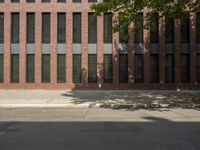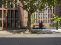 A modern mixed-use neighborhood in Berlin, Germany with residential and business properties, asphalt roads, and vegetation visible in the hard shadows of the day.