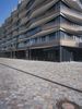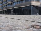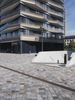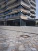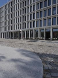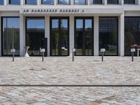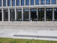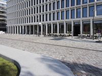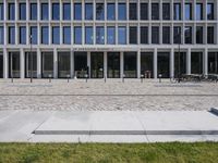 A modern cityscape of Berlin, Germany, featuring architecture, grass, buildings, trees, facades, windows, lines, walls, columns, walkways, road surfaces, profiles, public spaces, curbs, cobble stones, urban designs, concrete, floors, floorings, office buildings, apartments, mixed-uses, properties, corporate headquarters, real estates, condominiums, and a clear sky of a human settlement and material property.