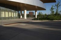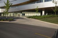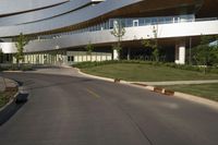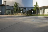A modern office building stands among the concrete roads and asphalt walkways of the city's business district. The view of the residential area, open space, and corporate headquarters is clear on this sunny day.