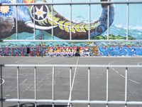 A bustling city life in Berlin, Germany. Urban design elements such as concrete surfaces, open spaces, and a graffiti wall contribute to the energy of this European city. Tourists and locals take advantage of the leisure activities like basketball, amusement parks, and racing tracks, while art and advertising add to the colorful atmosphere. Hinterhof, an art district, is home to a mural featuring a fictional character, adding a whimsical touch to the vibrant atmosphere.