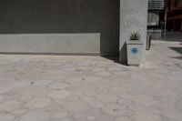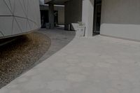 The facade of a concrete and cement apartment building, with its rows of windows and tiled walkways, stands out against the open urban space. The paver flooring, asphalt road surface, and plaza provide an interesting contrast in the city of Abu Dhabi, United Arab Emirates.