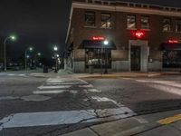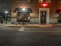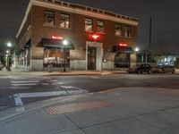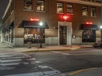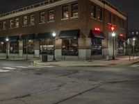 The classic architecture of the downtown neighborhood is illuminated by artificial light from the storefronts, restaurants, bars, and window reflections in a metropolitan area on a snowy evening. Automobiles pass by the low brick wall and residential area while a street light illuminates the asphalt road surface and curbside lane.