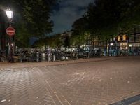 a night view of a street scene with bicycles parked on the pavement and the light in the dark above