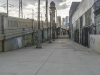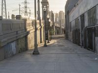 A view of the downtown area of a city in the early morning. The straight road is lined with buildings, trees, and other infrastructure including a train track and station, casting shadows on the concrete pavement and graffiti-covered walls. Automobiles and public transportation vehicles are present, poised to start the day's journey.