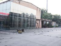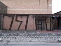 A colorful brick wall and iron structure facade of a building in the 798 Art Zone in Beijing, China. A public plaza and walkway with a clear sky and no automobiles, as people walk and explore the metropolitan area. The urban art district provides a unique glimpse of the city's transport, architecture, and structures.